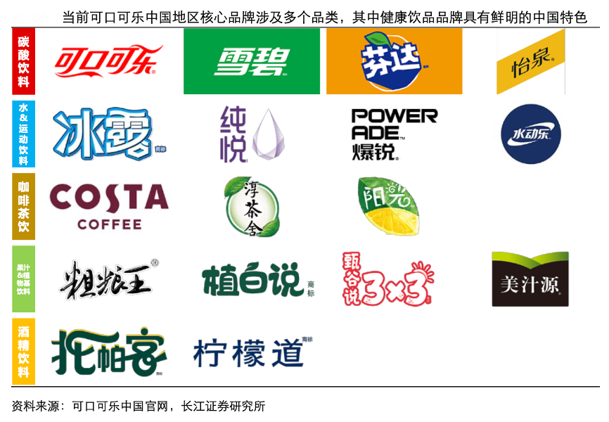經(jīng)典案例:根據(jù)可口可樂中國官網(wǎng)、長江證券研究所等綜合資訊表明,為應對中國市場消費者消費習慣與美國市場的差異,可口可樂公司在早期引進可樂、雪碧及芬達后就逐步開始開拓其他細分賽道的布局。當前,經(jīng)過不斷的創(chuàng)新孵化、收購與淘汰,可口可樂中國地區(qū)為消費者提供 20 個以上的品牌產(chǎn)品。