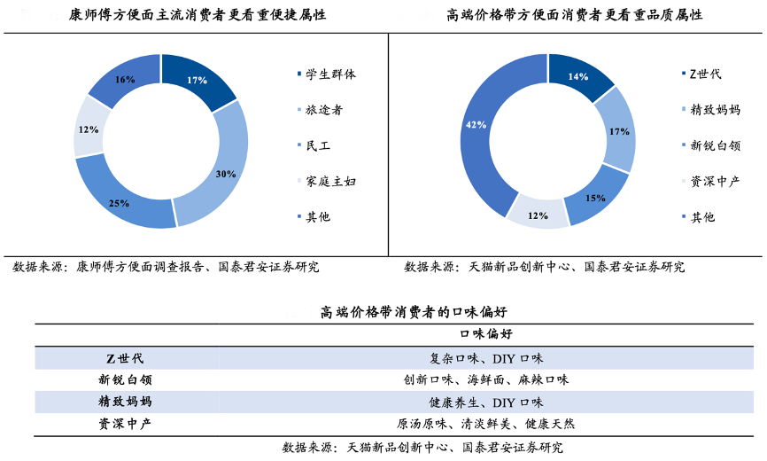 經(jīng)典案例:根據(jù)康師傅方便面調(diào)查報告、天貓新品創(chuàng)新中心、國泰君安證券研究等綜合資訊表明,隨著消費升級趨勢的演進,在方便面行業(yè)消費者的購買傾向逐漸從“方便”屬性轉(zhuǎn)移至“高品質(zhì)”屬性,康師傅方便面主流消費者為學生、旅途者及民工(在康師傅方便面消費者中合計占比達到7成),這部分人群更看重的是“便捷”屬性,以快速填飽肚子為目的,而高端價格帶方便面消費者以 Z 世代、精致媽媽、新銳白領及資深中產(chǎn)為主,這部分人群更看重產(chǎn)品的品質(zhì)屬性,愿意犧牲一部分便捷屬性。