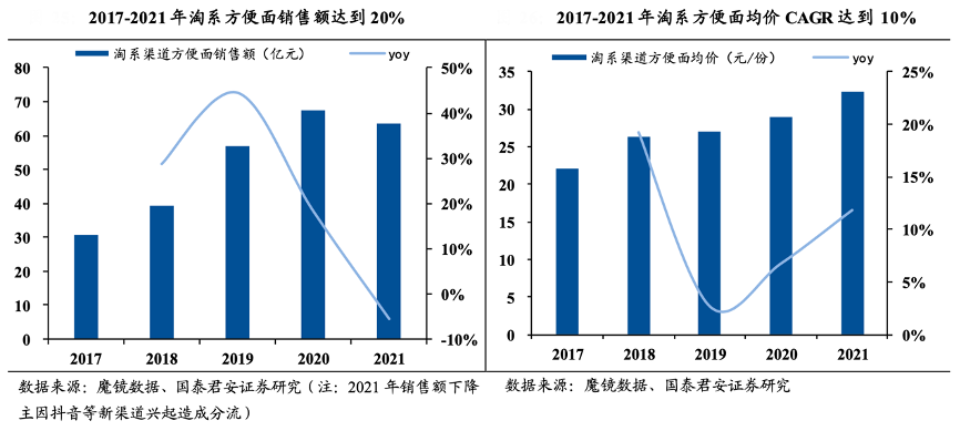 經(jīng)典案例:根據(jù)魔鏡數(shù)據(jù)、國泰君安證券研究等綜合資訊表明,抓住消費升級契機的新品牌自下而上做大了線上高端方便主食行業(yè),并且實現(xiàn)了更高市場份額的反哺。淘系整體均價從 2017 年的 22 元/份持續(xù)提升至 2021 年的32 元/份,均價居于高端價格帶并且 4 年 CAGR 達到 10%。
