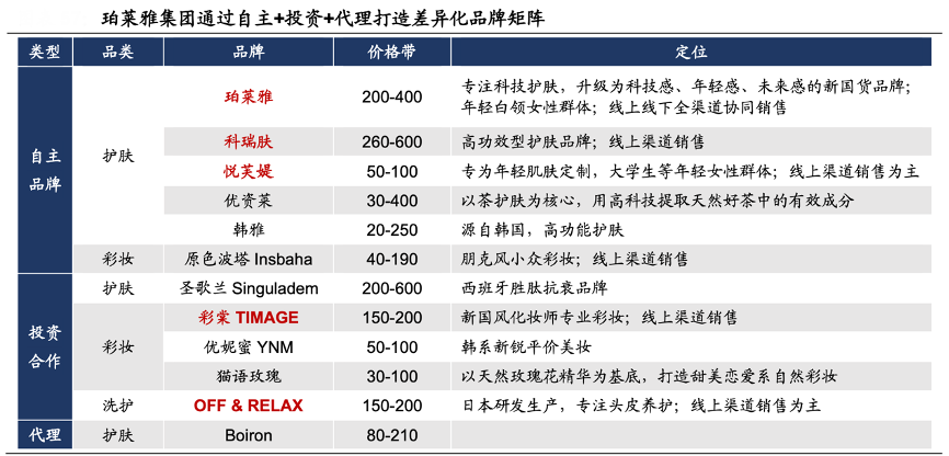 經(jīng)典案例:根據(jù)公司公告、各品牌官網(wǎng)、華福證券研究所等綜合資訊表明,珀萊雅 2009 年起即開始進行多品牌建設,至今通過內(nèi)生孵化、外部參股、代理等形式建立起多品牌、多品類的產(chǎn)品矩陣,致力于構(gòu)建新國貨化妝品產(chǎn)業(yè)平臺。自主品牌方面,主品牌珀萊雅瞄準年輕白領女性群體主打大眾化科技護膚,悅芙媞專為大學生等年輕女性群體的年輕肌膚定制,科瑞膚聚焦高功效護膚領域;投資合作方面,彩棠聯(lián)合專業(yè)化妝師唐毅打造新國風彩妝品牌,OFF & RELAX 源于日本研發(fā),專注頭皮養(yǎng)護。