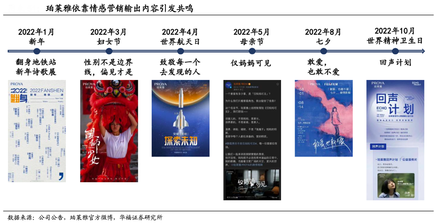 經(jīng)典案例:根據(jù)公司公告、珀萊雅官方微博、華福證券研究所等綜合資訊表明,2021年起,珀萊雅在簽約代言人營銷之外加碼情感營銷,持續(xù)不斷地輸出優(yōu)質(zhì)內(nèi)容,敏銳洞察社會熱點。2021 年 3 月在國際婦女節(jié)之際,珀萊雅聯(lián)合《中 國婦女報》共同發(fā)起“性別不是邊界線,偏見才是”話題,聯(lián)動 KOL 積極發(fā)聲,微博 TVC 播放量近400 萬次;2022 年 3 月延續(xù)此話題,邀請醒獅全女班以及女足運動員推出《醒獅少女》主題片,微博視頻播放量再度接近 400 萬次,引起廣泛共鳴。10 月在世界精神衛(wèi)生日再次推出回聲計劃,聚焦青年心理健康,增強與核心受眾的 情感連接,進一步強化品牌價值。