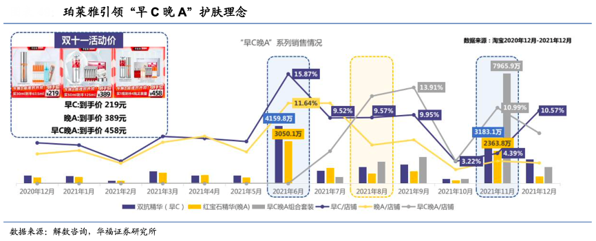 經(jīng)典案例:根據(jù)解數(shù)咨詢、華福證券研究所等綜合資訊表明,珀萊雅公司結(jié)合成功傳播的“早 C 晚 A”概念,2021 年 6 月推出雙抗精華+紅寶石精華套裝,相對于獨(dú)立單品,采取低件單價(jià)、高客單價(jià)的產(chǎn)品策略,前期種草鋪設(shè)和持續(xù)進(jìn)行消費(fèi)者教育,2021 年雙 11 期間實(shí)現(xiàn)“早 C 晚 A”套裝的爆發(fā),2021 年 11 月在淘系平臺以 7965.9 萬元的銷售額超越兩大單品 GMV 之和,淘系平臺的銷售占比達(dá)到 10.99%。