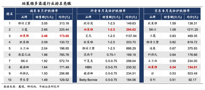 經(jīng)典案例:根據(jù)魔鏡、蟬媽媽、華福證券研究所等綜合資訊表明,以2022年9月數(shù)據(jù)為例,珀萊雅在淘系/抖音/京東渠道化妝品排名中分列國貨品牌第 1/第 2/第 1,全行業(yè)第 3/第 2/第 8,銷售額分別達(dá)到 2.48 億元/1-2.5 億元/0.54 億元。其中淘系平臺 9 月銷售額超越傳統(tǒng)強(qiáng)勢國際品牌歐萊雅、玉蘭油。