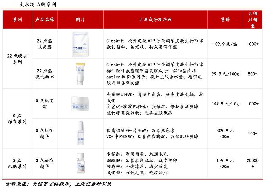 經(jīng)典案例:根據(jù)天貓官方旗艦店、上海證券研究所等綜合資訊表明,結(jié)合肌膚生物節(jié)律,大水滴產(chǎn)品分為三大時(shí)間系列,同時(shí)2022H1其聚焦 3 點(diǎn)祛痘精華打造大單品,斬獲天貓、抖音、快 手等多渠道祛痘精華銷量 top1, 全網(wǎng)銷售超百萬(wàn)瓶,品牌 GMV 破億。