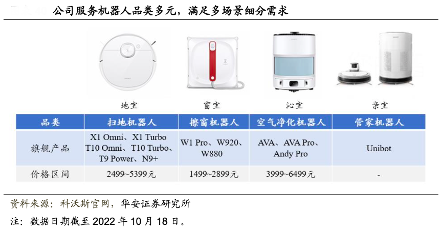經(jīng)典案例:根據(jù)科沃斯官網(wǎng)、華安證券研究所等綜合資訊表明,科沃斯公司 ToC 產(chǎn)品品類包括掃地 機器人(地寶)、擦窗機器人(窗寶)、空氣凈化機器人(沁寶)和管家機器人(親寶) 四類,可滿足家庭生活中不同場景的細分需求。其中,掃地機器人是服務機器人板塊中主力品類,貢獻服務機器人業(yè)務90%以上營收。