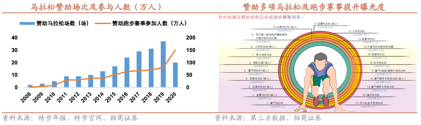 經(jīng)典案例:根據(jù)特步年報(bào)、特步官網(wǎng)、第三方數(shù)據(jù)、招商證券等綜合資訊表明,特步馬拉松賽事贊助強(qiáng)化品牌跑步基因。2008-2019 年期間,贊助馬拉松賽事場次從 2 場增長至 37 場,贊助賽事參與人 數(shù)從 1.1 萬人增長至 80 萬人,15 年以來連續(xù)蟬聯(lián)中國內(nèi)地贊助最多馬拉松賽事的體育用品贊助商,品牌曝光度提升。