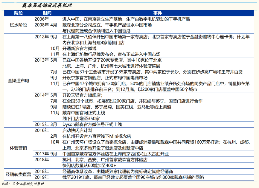 經(jīng)典案例:根據(jù)市場公開資料、國金證券研究所等綜合資訊表明,戴森中國線上:線下渠道收入比例約為1:1,其渠道鋪設(shè)進(jìn)展,并將其劃分為 4 個(gè)階段:試水階段、全渠道布局、轉(zhuǎn)型體驗(yàn)營銷、經(jīng)銷商改革。伴隨門店數(shù)量持續(xù)擴(kuò)張,截至 2019 年底,戴森已經(jīng)建立起覆蓋全國90座城市約 800 家戴森店鋪的網(wǎng)絡(luò)。