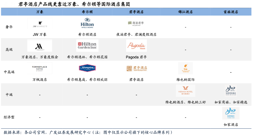 經(jīng)典案例:根據(jù)各公司官網(wǎng)、廣發(fā)證券發(fā)展研究中心等綜合資訊表明,萬豪旗下的JW萬豪、萬豪、萬楓等,希爾頓旗下的希爾頓、希爾頓花園、希爾頓歡朋等,均將公司名稱融入品牌線中。集約化的命名方式,不僅便于品牌力的傳導(dǎo),并且使品牌群在消費(fèi)者心中形成天然的聯(lián)系,提升品牌粘性。