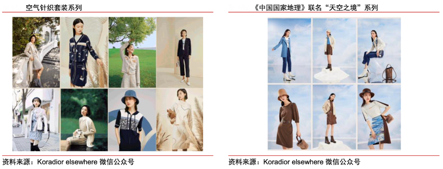 經(jīng)典案例:根據(jù)Koradior elsewhere微信公眾號、中信證券研究部等綜合資訊 表明,2021年珂思空氣針織套裝將“針織梭織化”,打破對針織款式的刻板印象,提升面料的光澤感和挺闊度。聯(lián)名《中國國家地理》,傳達自然舒適理念。2021 年珂思從《中國國家地理》收錄的 風光圖譜汲取靈感,以抽象的藝術手法將自然之韻榮譽時裝設計,獲得西藏扎布耶茶卡鹽 湖、新疆伊犁霍城縣薩爾布拉克鎮(zhèn)、內(nèi)蒙古黃崗梁圖鑒授權,分別推出“天空之境”“絕美伊犁”“膠囊系列—共生”三大聯(lián)名系列,傳達品牌敬畏自然,堅持可持續(xù)時尚的理念。