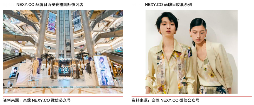 經(jīng)典案例:根據(jù)奈蔻NEXY.CO微信公眾號、中信證券研究部等綜合資訊表明,2021 年 7 月 12 日到 7 月 18 日品牌周,奈蔻在上海、西安、成都、南京等城市開設線下快閃店,開展智 美探覓主題大秀,并攜手代言人王珞丹同步推出品牌日膠囊系列。該系列將品牌花“木蘭 花”融入產(chǎn)品設計,贊頌當代智美女性淡然、堅韌的品格意志,并全面升級天然材料和環(huán)保工藝,融合智美定位與環(huán)保理念。