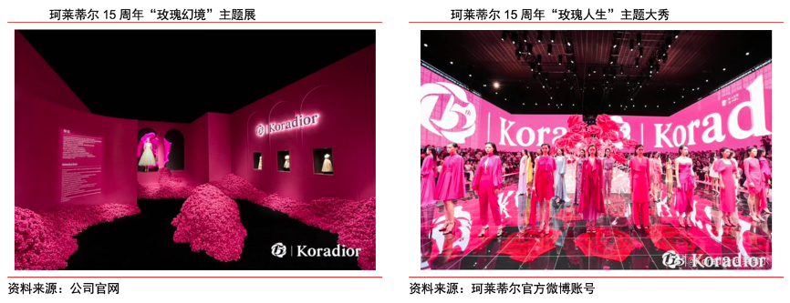 經(jīng)典案例:根據(jù)公司官網(wǎng)、珂萊蒂爾官方微博帳號(hào)、中信證券研究部等綜合資訊表明,2022 年 8 月珂萊蒂爾 15 周年“玫瑰人 生”主題大秀于深圳文華酒店開啟,先后展出“玫瑰人生”“優(yōu)雅主義”“花園派對(duì)”“多 維爾的盛宴”四大系列,以全新視角回溯經(jīng)典系列,并同步發(fā)布大片《經(jīng)典裙聲》,通過(guò)千余條連衣裙展現(xiàn)優(yōu)雅之姿,講述品牌連衣裙故事,深化女人味的品牌定位。