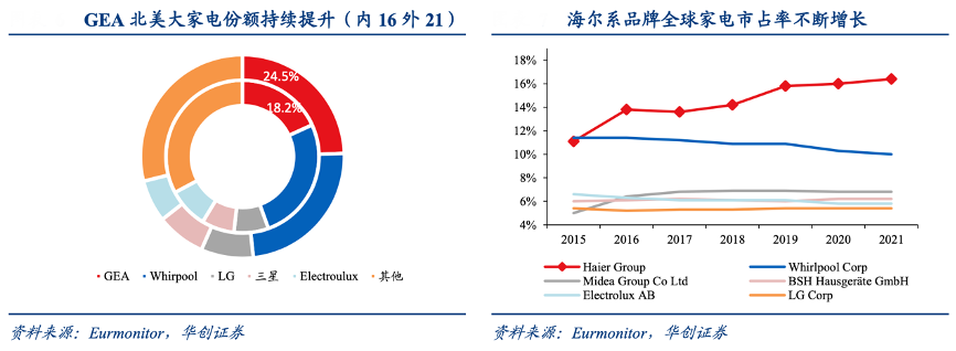 經(jīng)典案例:根據(jù)Eurmonitor、華創(chuàng)證券等綜合資訊表明,海爾自 2011 年起陸續(xù)兼并收購三洋白電、GEA、FPA、Candy 等海外優(yōu)質(zhì)資產(chǎn),完成全球品牌的搶占收購,并充分發(fā)揮與各地品牌的協(xié)同效應(yīng)。以 GEA 為例,雙方基于產(chǎn)品結(jié)構(gòu)、市場區(qū)域差異性,通過各類協(xié)同實現(xiàn)了冰洗廚電優(yōu)勢互補,GEA 北美市占率穩(wěn)步提升。