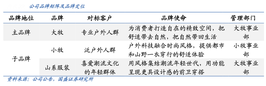 經(jīng)典案例:根據(jù)公司公告、國盛證券研究所等綜合資訊表明,2021年,牧高笛公司對品牌理念進行進一步升級,形成了以“大牧”(Mobi Garden)為主品牌,“小牧”(Mobi Garden Urban)與“山系服裝”(MOBI VILLA)為子品牌的品牌矩,并明確品牌風格和對標客戶,即“大牧”品牌主要提供戶外專業(yè)裝備及服裝,“小牧”品牌主要提供多場景穿著。