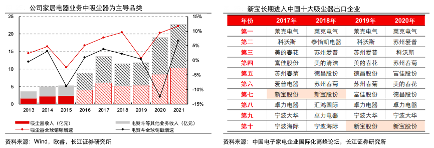 經(jīng)典案例:根據(jù)wind、歐睿、中國電子家電企業(yè)國際化高峰論壇、長江證券研究所等綜合資訊表明,新寶公司經(jīng)營中,吸塵器在公司家居電器業(yè)務中占主導地位,2013-2015年,吸塵器在家居電器業(yè)務中的占比穩(wěn)定在45%,電熨斗等其他品類占比穩(wěn)定在55%;考慮到家居電器主要以外銷為主,且近年來吸塵器海外增速持續(xù)優(yōu)于電熨斗表現(xiàn),預計吸塵器業(yè)務占比仍在穩(wěn)步提升,2017-2020 年間公司連續(xù)進入中國十大吸塵器出口企業(yè)榜單。