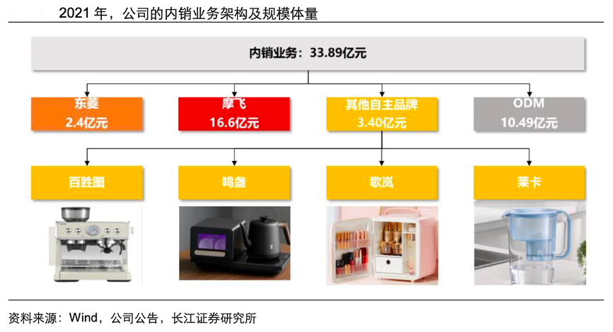 經(jīng)典案例:根據(jù)wind、公司公告、長江證券研究所等綜合資訊表明,新寶內(nèi)銷已形成多品牌經(jīng)營矩陣,子品牌共用新寶研發(fā)、生產(chǎn)平臺,營銷層面各自推廣。其中,關(guān)注度最高且表現(xiàn)最為亮眼的當屬“摩飛”,成就了 2017 年確立代 理至 2021 年收入達到 16.6 億的成長奇跡;其次,東菱作為早期成立的子品牌,經(jīng)多年 發(fā)展,2021 年收入規(guī)模達到 2.4 億。