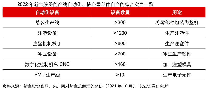 經(jīng)典案例:根據(jù)新寶股份官網(wǎng)、央廣網(wǎng)對(duì)新寶總經(jīng)理的采訪、長(zhǎng)江證券研究所等綜合資訊表明,2022年新寶持續(xù)推進(jìn)零部件自動(dòng)化,新增了 60 余臺(tái) CNC 機(jī)床,100 余臺(tái)注塑設(shè)備。新寶具有模具、注塑件、電子元件等關(guān)鍵零部 件生產(chǎn)能力,柔性生產(chǎn)能力較強(qiáng),在多批次、小規(guī)模的中小訂單上,形成較優(yōu)的規(guī)模優(yōu)勢(shì)。
