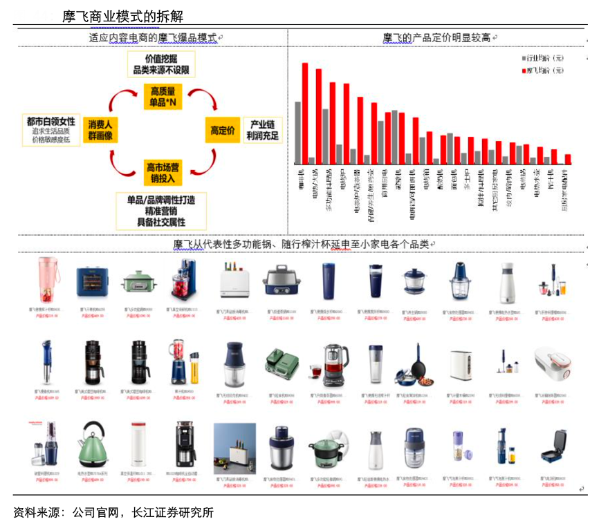 經(jīng)典案例:根據(jù)公司官網(wǎng)、長(zhǎng)江證券研究所等綜合資訊表明,摩飛的爆品模式重點(diǎn)在于:精準(zhǔn) SKU 投放背景下產(chǎn)品以大單品、 少 SKU的形式開(kāi)展;同時(shí)內(nèi)容電商對(duì)費(fèi)用投放的較高要求,摩飛將人群限定在“相對(duì)高消費(fèi)、追求品質(zhì)生活的女性人群”且產(chǎn)品采用高定價(jià)。