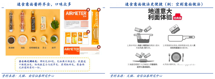 經(jīng)典案例:根據(jù)天貓、安信證券研究中心等綜合資訊表明,一般自己做意面方法需要的原料眾多,相對速食意面較為繁雜,而速食意面有效解決了烹 飪的諸多過程,同時(shí)提供豐富多樣的口味,讓消費(fèi)者在家也能做出餐廳級意面,受眾人群更廣。