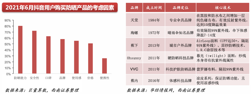 經(jīng)典案例:根據(jù)巨量算數(shù)、華經(jīng)情報(bào)網(wǎng)、西南證券等綜合資訊表明,目前國內(nèi)市場上頭部防曬服飾品牌均具有其各自核心防曬技術(shù),例如蕉下具有L.R.C涂層(主要為鈦氧化物紫外線反射劑)能實(shí)現(xiàn)UPF50+,而Ohsunny紗線本身采用雷 羅娜布料,可以隔阻99%紫外線。