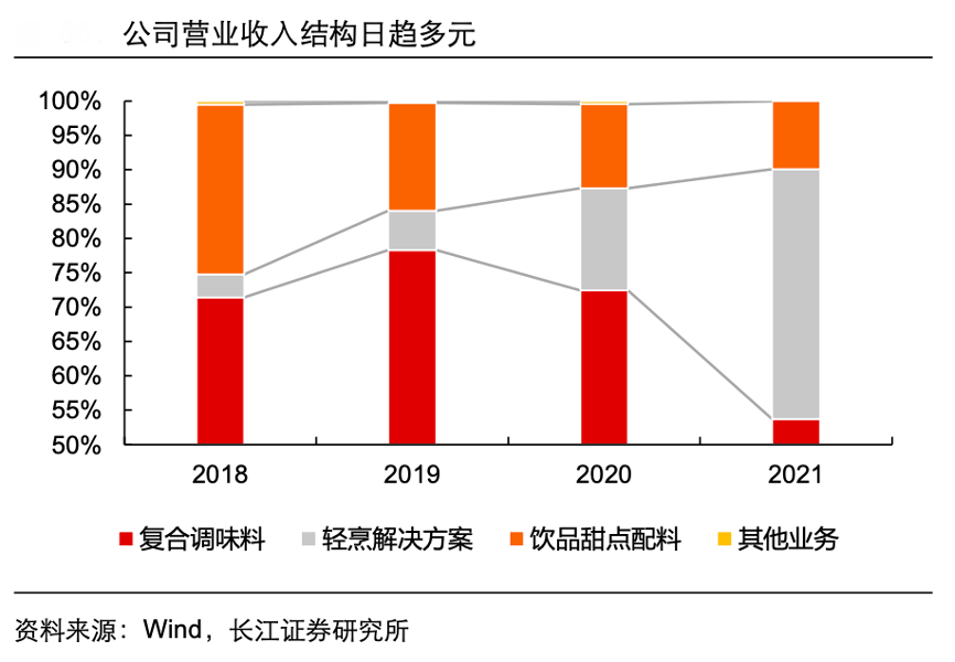 經(jīng)典案例:根據(jù)wind、長江證券研究所等綜合資訊表明,2018年至2021年,寶立食品公司輕烹解決方案和飲品甜點配料營業(yè)收入占比從 28.18%提高至 46.29%,公司產(chǎn)品結(jié)構(gòu)更加多元化。