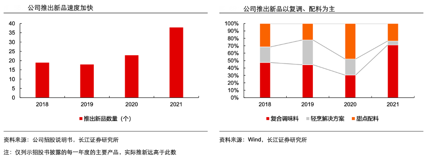 經(jīng)典案例:根據(jù)公司招股說明書、wind、長江證券研究所等綜合資訊表明,寶立食品公司研發(fā)部持續(xù)進(jìn)行新產(chǎn)品、新工藝、新技術(shù)的研發(fā)等,每年均有一定量的新品研發(fā)成果。2020年以來公司推新速度加快,每年公司推出并形成銷售新品數(shù)百種甚至近千種規(guī)模。
