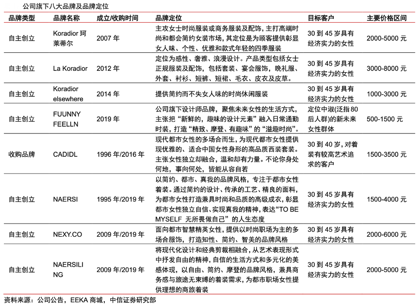 經(jīng)典案例:根據(jù)公司官網(wǎng)、中信證券研究部等綜合資訊表明,贏家時尚目前旗下共八大自主品牌,可分為高端線的 Koradior、La Koradior、Koradior elsewhere、NAERSI、NAERSILING、 NEXY.CO 、CADIDL,以及 2019 年新成立的中端品牌 FUUNNY FEELLN。八大品牌風格定位及產(chǎn)品價格區(qū)間亦有差異:其中雙主品牌 Koradior 和NAERSI,以及收購品牌 NEXY.CO 、CADIDL 主要為都市女性提供商務(wù)或休閑服飾,主流產(chǎn)品價格區(qū)間位于2000 到 5000 元。