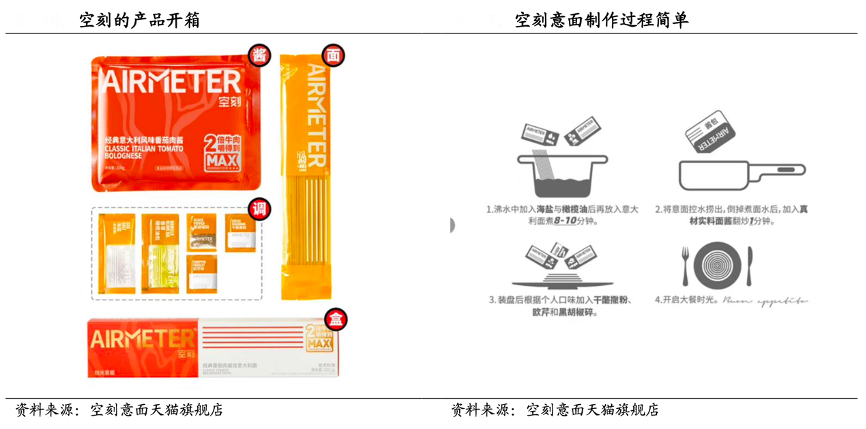經(jīng)典案例:根據(jù)空刻意面天貓旗艦店、國(guó)海證券研究所等綜合資訊表明,一盒空刻意面的產(chǎn)品包括 6 個(gè)料包,分別是意面醬,海鹽,歐洲進(jìn)口橄欖油,干 酪包,歐芹包與黑胡椒包。產(chǎn)品整體重量 270g,其中意面醬料包就達(dá)到150g。在制作方法上,只需要將意大利面水煮 8-10 份中,然后將翻炒過(guò)的意面醬和其他料包淋在意面上即可。制作過(guò)程非常簡(jiǎn)單快捷。