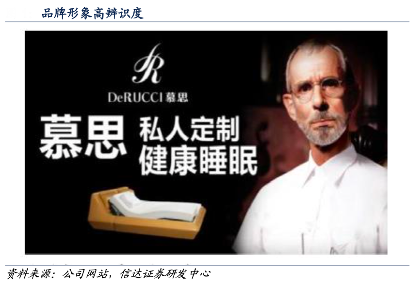 經(jīng)典案例:根據(jù)公司網(wǎng)站、信達(dá)證券研發(fā)中心等綜合資訊表明,慕思公司十分重視健康睡眠理念的推廣,通過(guò)極具辨識(shí)度的“老人形象”品牌視覺(jué)向廣大消費(fèi)者傳遞公司專(zhuān)業(yè)和專(zhuān)注的工匠精神,“慕思”品牌已深入人心,目前慕思床墊在國(guó)內(nèi)市場(chǎng)銷(xiāo)售排名第一。