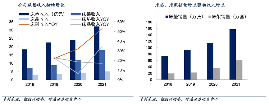 經(jīng)典案例:根據(jù)招股說(shuō)明書(shū)、信達(dá)證券研發(fā)中心等綜合資訊表明,床墊公司自 2018 年以來(lái)床墊銷(xiāo)售收入 逐年持續(xù)增長(zhǎng)。床架作為床墊產(chǎn)品的載體,是健康睡眠系統(tǒng)的主要組成部分。一方面,公司床墊產(chǎn)品的銷(xiāo)售增長(zhǎng)會(huì)拉動(dòng)床架產(chǎn)品的銷(xiāo)售增長(zhǎng);另一方面,床架產(chǎn)品的銷(xiāo)售增長(zhǎng)也會(huì)促進(jìn)床墊產(chǎn)品的銷(xiāo)售增長(zhǎng)。