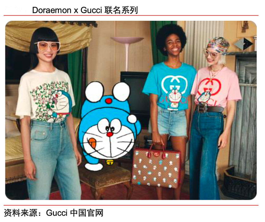 經(jīng)典案例:根據(jù)Gucci中國官網(wǎng)、中信證券研究部等綜合資訊表明,Gucci品牌積極推進與年輕一代中流行的品牌和 IP 進行聯(lián)名活動,包括與巴黎世家、哆啦 A 夢和 Adidas 合作推出聯(lián)名產(chǎn)品,其中哆啦A夢聯(lián)名款在 TikTok 平臺上點贊超過 30 萬,進一步擴大在年輕客群的品牌影響力。