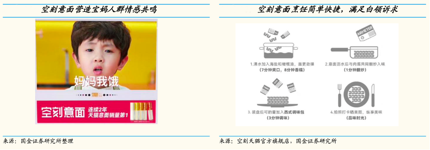 經(jīng)典案例:根據(jù)空刻天貓官方旗艦店、國金證券研究所等綜合資訊表明,面對精致寶媽,空刻抓住“愛 孩子”、“注重產(chǎn)品健康安全”等特點,以電媒“媽媽我餓”等廣告詞,營造寶媽情感共鳴。面對資深中產(chǎn),這類消費人群往往注重品質(zhì)和健康生活,空刻以富含橄欖 油、海鹽等進口食材為賣點,打出與意大利米其林三星大廚合作研發(fā)的王牌,加深空刻與正宗意大利面的綁定。