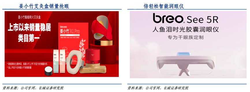 經(jīng)典案例:根據(jù)公司官網(wǎng)、長城證券研究院等綜合資訊表明,2021年8月倍輕松推出首款智能艾灸盒,切入理療賽道,推出至今智能艾灸盒銷量已超過 20 萬臺,累計銷量過億,相當于公司同期收入的 10%。2022 年 5 月,公司針對干眼人群推出智能潤眼儀,進一步凸顯新品類耗材屬性,完善硬件+耗材的商業(yè)模式,助力公司提升復購率和粘性。