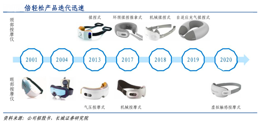 經(jīng)典案例:根據(jù)公司招股書、長(zhǎng)城證券研究院等綜合資訊表明,倍輕松公司眼部按摩儀自 2001 年至今經(jīng)歷過(guò)五次迭代,產(chǎn)品技術(shù)由傳統(tǒng)氣壓式發(fā)展至虛擬觸感式,目前能最大限度地還原真人手指揉按的手法及觸感,并且還嵌入物聯(lián)網(wǎng)模組,使其能夠?qū)崿F(xiàn)智能傳感和控制功能。頸部按摩儀產(chǎn)品迭代同樣迅速, 短短十年時(shí)間也迭代四次。