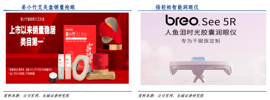 經(jīng)典案例:根據(jù)公司官網(wǎng)、長(zhǎng)城證券研究院等綜合資訊表明,優(yōu)異的自研實(shí)力助力倍輕松公司不斷擴(kuò)充產(chǎn)品品類,2021 年 8 月推出首款智能艾灸盒,切入理療賽道,推出至今智能艾灸盒銷量已超過(guò) 20 萬(wàn)臺(tái),累計(jì)銷量過(guò)億,相當(dāng) 于公司同期收入的10%。2022 年 5 月,公司針對(duì)干眼人群推出智能潤(rùn)眼儀,進(jìn) 一步凸顯新品類耗材屬性,完善硬件+耗材的商業(yè)模式,助力公司提升復(fù)購(gòu)率和粘性。
