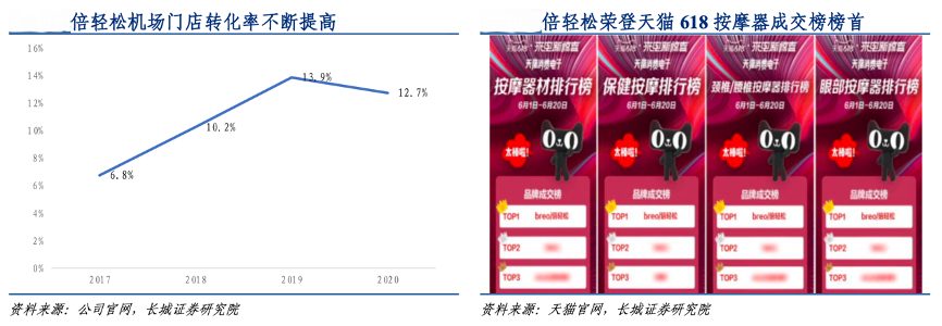 經(jīng)典案例:根據(jù)公司官網(wǎng)、天貓官網(wǎng)、長城證券研究院等綜合資訊表明,在簽約肖戰(zhàn)后的天貓 618 節(jié)促活動中,倍輕松公司多款產(chǎn)品銷量榮登同類目銷量榜榜首。同時,2017-2020年,公司機(jī)場門店的客流轉(zhuǎn)化率持續(xù)提高,從6.8%提升至12.7%,增幅約為 5.9 個百分點。