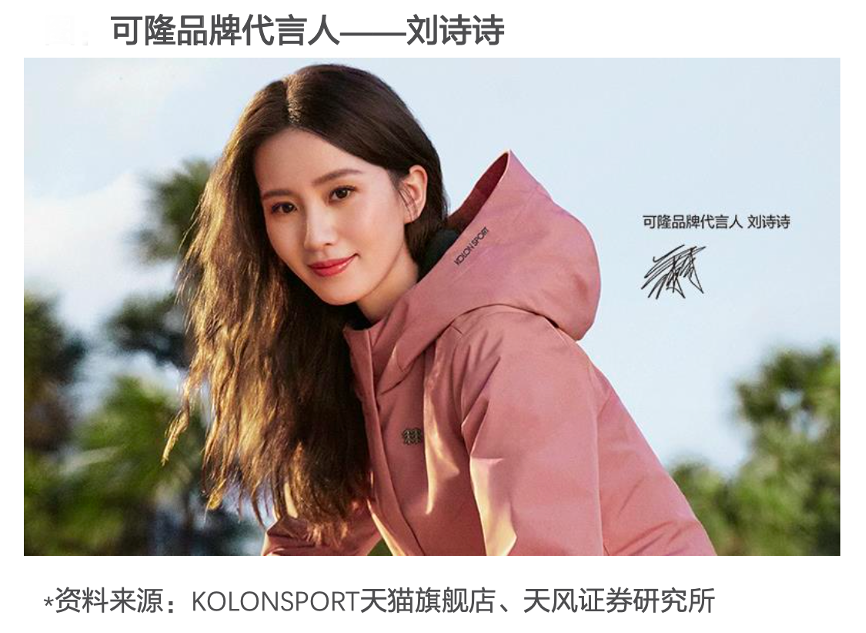經(jīng)典案例:根據(jù)KOLONSPORT天貓旗艦店、天風(fēng)證券研究所等綜合資訊表明,女性用戶更容易上手輕戶外覆蓋的旅行、徒步、登山、露營、釣魚、打獵等休閑戶外運動,可隆也擁有著比其他戶外品牌更高的女性消費群體占比,其選擇了“劉詩詩”為品牌代言人。