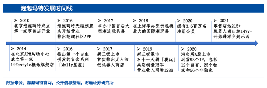 經(jīng)典案例:根據(jù)泡泡瑪特官網(wǎng)、公開信息整理、財通證券研究所等綜合資訊表明,截至2021年末,泡泡瑪特公司設(shè)置葩趣用以孵化與泡泡瑪特風(fēng)格差異較大的潛力 IP,并設(shè)立藝術(shù)推廣機(jī)構(gòu) inner flow 打造高端藝術(shù)衍生品;渠道端公司線下門店數(shù)量已達(dá)到 288 家,擁有 1861 臺機(jī)器人商店,線上端已連續(xù)三年取得天貓雙十一玩具類目銷售額第一名。
