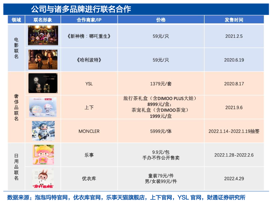 經(jīng)典案例:根據(jù)泡泡瑪特官網(wǎng)、優(yōu)衣庫官網(wǎng)、樂事天貓旗艦店、上下官網(wǎng)、YSL官網(wǎng)、財通證券研究所等綜合資訊表明,泡泡瑪特不斷通過將 IP 與實體消費品聯(lián)名結(jié)合,將自身 IP 融入大眾消費,進(jìn)一步增強(qiáng) IP 的曝光與破圈。以“SKULLPANDA”與“DIMOO”為例,“SKULLPANDA”與 LV 旗下美妝品牌“MAKE UP FOREVER”達(dá)成合作共同推出聯(lián)名款玩偶,嘗試時裝走秀,并聯(lián)合高校舉辦“SKULLPANDA”仿妝大賽。