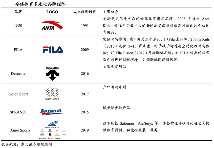 經(jīng)典案例:根據(jù)公司官網(wǎng)、東北證券等綜合資訊表明,安踏“多品牌”戰(zhàn)略布局。其中專業(yè)運(yùn)動(dòng)品牌群包括安踏、安踏兒童、 SPRANDI;時(shí)尚運(yùn)動(dòng)品牌群包括 FILA、FILA FUSION、FILA KIDS;戶外運(yùn)動(dòng)品牌群包括 Descente、Kolon、Amer Sports 等。安踏體育全方位的覆蓋運(yùn)動(dòng)服飾的細(xì)分領(lǐng)域、不同年齡的消費(fèi)者,并且針對(duì)不同消費(fèi)能力的群體,產(chǎn)品市場(chǎng)定位形成差異化布局。