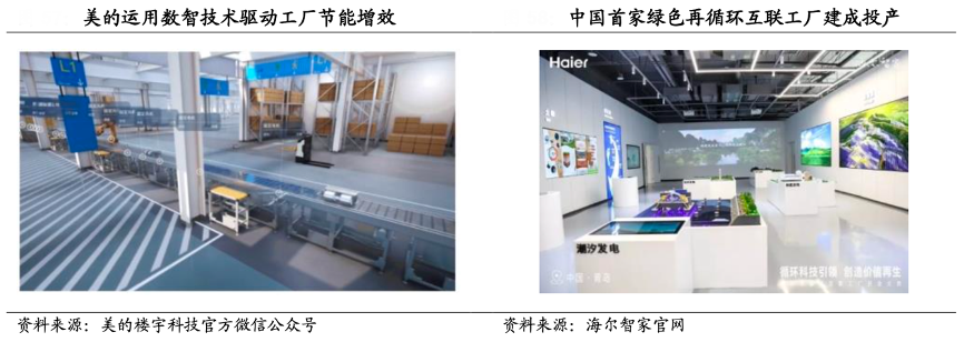 經(jīng)典案例:根據(jù)美的樓宇科技官方微信公眾號、海爾智家官網(wǎng)、國海證券研究部等綜合資訊表明,美的和海爾均較早布局?jǐn)?shù)智化轉(zhuǎn)型,深耕多年已成果累累。11 月 22 日美的樓宇科技荊州工廠正式投產(chǎn), 這是立足iBUILDING 美的樓宇數(shù)字化平臺打造的首個數(shù)智工廠,運用 BIoT、數(shù)字孿生等技術(shù)打造全生命周期綠色低碳規(guī)劃,運維成本降低 30%,車間耗電量降低 5-20%,預(yù)計年產(chǎn)能達(dá)到 500 萬臺以上。海爾智家于2022年9月2日海爾智家建設(shè)的中國首家綠色再循環(huán)互聯(lián)工廠在青島萊西建成投產(chǎn),積極踐行智能化綠色化融合發(fā)展。