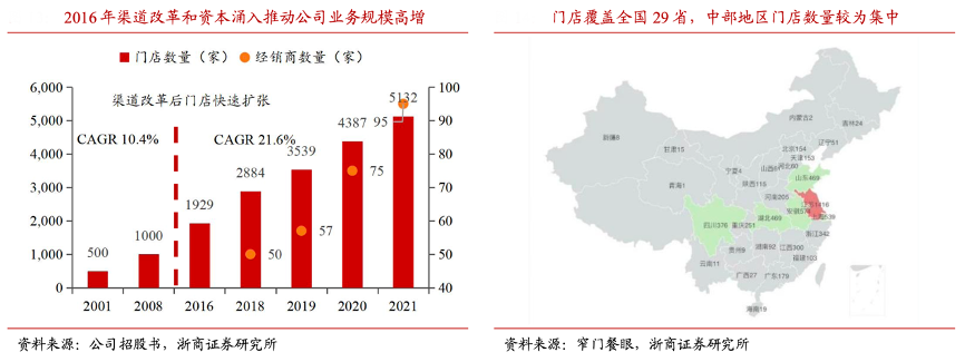 經(jīng)典案例:根據(jù)公司招股書、窄門餐眼、長城證券研究院等綜合資訊表明,截至 2022 年 9 月,紫燕食品公司現(xiàn)有門店總數(shù)為 6030 家。2016 年公司改革加盟模式,由“直接管理加盟”調(diào)整為“公司-一級經(jīng)銷商-二級加盟商”兩級模式,降低新門店開發(fā)時間及成本不確定性、渠道管理難度。2018-2021 年門店數(shù)量 CAGR 達到 22%,江蘇、上海、安徽、湖北、四川、山東等六大鹵味重點省份門店數(shù)量占總門店的65%。
