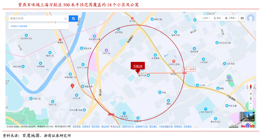 經典案例:根據百度地圖、浙商證券研究所等綜合資訊表明,從門店的業(yè)態(tài)分布看,紫燕百味雞門店選址多位于社區(qū)、農貿市場及周邊位置,方便 C 端消費者購買,更貼近家庭消費人群的正餐需求。以上海萬航店(社區(qū)店)為例,門店 500 米半徑范圍內共有約 18 個小區(qū)及公寓,同時包括小學、中學、老年大學等,周邊居民多為家庭住戶,外出就餐需求相對弱,對佐餐鹵味的需求量相對更高。