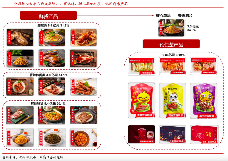 經典案例:根據公司招股書、浙商證券研究所等綜合資訊表明,紫燕食品公司產品以鮮貨類為主、預包裝產品為輔,核心大單品為“夫妻肺片”和“百味雞”,應用場景以佐餐消費為主、休閑消費為輔。