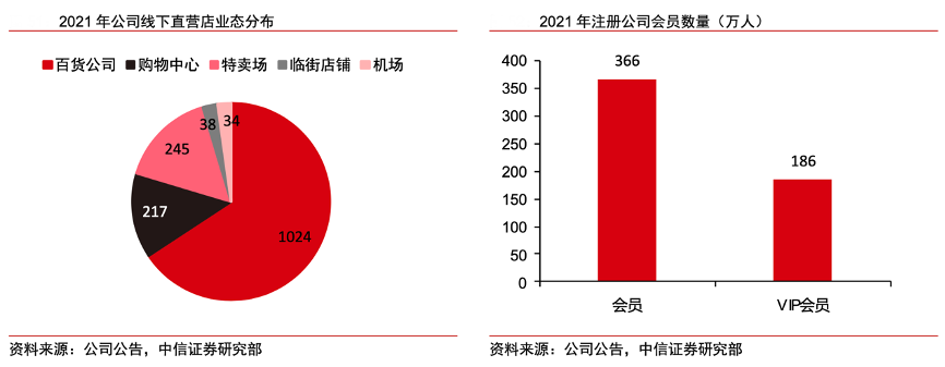 經典案例:根據公司公告、中信證券研究部等綜合資訊表明,贏家時尚公司直營店中,1024家設于百貨公司,217家位于購物中心,且大部分都是黃金商業(yè)地段,和品牌定位相得益彰。其中購物中心、特賣場門店增長速度較快,門店數(shù)量分別增長 19%、14%。同時截至 2021 年末,會員注冊人數(shù)達到 366 萬,比年初增長 24%,其中包括 165 萬 VIP 會員,積累了較為豐富的顧客資源。