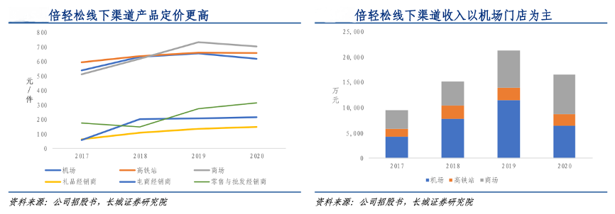 經(jīng)典案例:根據(jù)公司招股書(shū)、長(zhǎng)城證券研究院等綜合資訊表明,倍輕松公司直營(yíng)門店聚集于客流量較大的機(jī)場(chǎng)、高鐵站以及一二線城市核心商圈。截至 2021 年 6 月 30 日,公司商場(chǎng)門店覆蓋了全國(guó) 4 個(gè)一線城市、13 個(gè)新一線城市、16 個(gè)二線城市。高客流消費(fèi)力匹配公司高端產(chǎn)品定價(jià)。2017-2020年公司直營(yíng)門店價(jià)格普遍在 500-700 元,遠(yuǎn)高于線上線下經(jīng)銷渠道 100-300 元的產(chǎn)品價(jià)格區(qū)間。