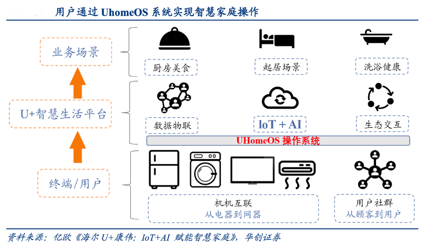 經(jīng)典案例:根據(jù)億歐《海爾U+康偉:IOT+AI賦能智慧家庭》、華創(chuàng)證券等綜合資訊表明,UhomeOS 發(fā)布于2016 年,是海爾專為智慧家庭定制的生態(tài)操作系統(tǒng), 涵蓋臥室起居、廚房美食、浴室洗護等多個場景,可以通過 UhomeOS 系統(tǒng)把用戶、家電、服務(wù)三者串聯(lián)起來,提供全屋智能落地方案。