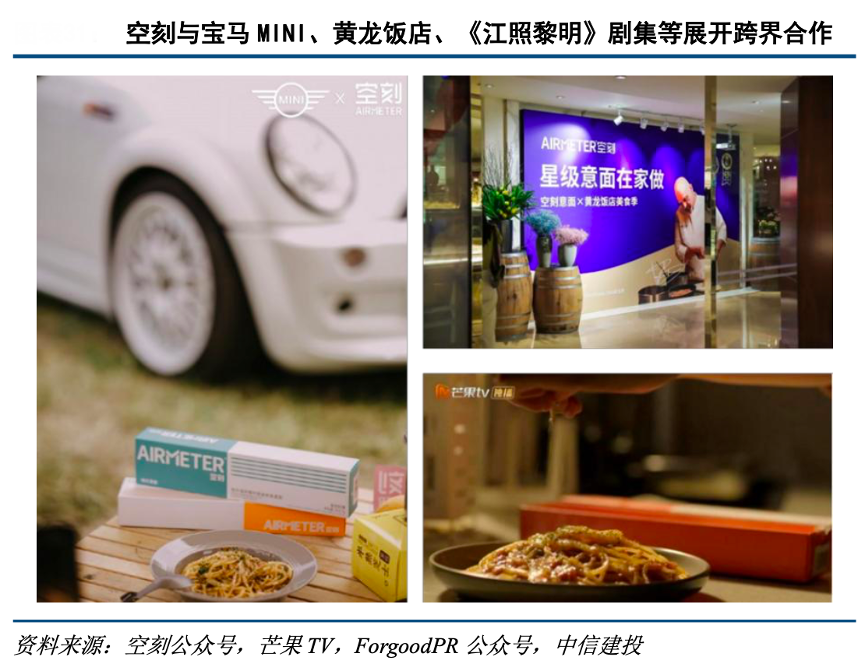經(jīng)典案例:根據(jù)空刻公眾號(hào)、芒果TV、ForgoodPR公眾號(hào)、中信建投等綜合資訊表明,品牌聯(lián)名合作方面,空刻更為關(guān)注用戶重疊度,同寶馬 mini、 黃龍飯店、雀巢、劇集《江照黎明》等合作,滲入年輕白領(lǐng)、精致寶媽、中產(chǎn)階級(jí)等目標(biāo)群體的日常生活,推動(dòng)品牌從“網(wǎng)紅”向“長(zhǎng)紅”。