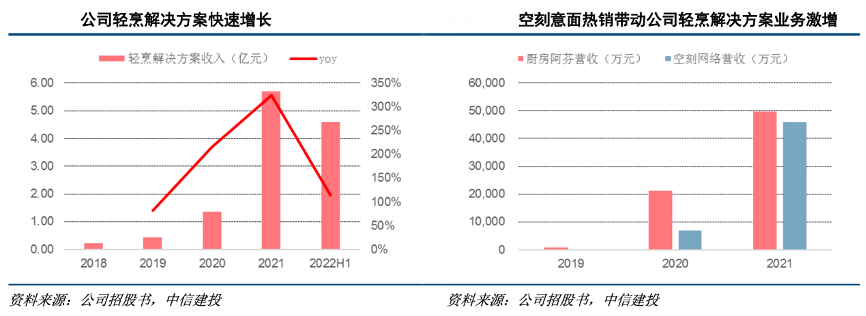 經(jīng)典案例:根據(jù)公司招股書、中信建投等綜合資訊表明,2019 年 11 月,廚房阿芬與寶立食 品合作開發(fā)新品氫刻意面(后更名為空刻意面),首創(chuàng)國(guó)內(nèi)速食意面新品類,連續(xù)三年蟬聯(lián)天貓銷售榜首。公司 2020 年輕烹解決方案同比增長(zhǎng) 215.26%,主要來自空刻意面 2020 年的銷量大漲,彼時(shí)公司已為空刻意面供應(yīng)輕烹料 理醬包、歐芹撒粉和蒜香油包等輕烹解決方案產(chǎn)品;2021年輕烹解決方案業(yè)務(wù)同增 324.33%,也主要來自收購廚房阿芬后其旗下空刻意面產(chǎn)品銷售持續(xù)高增。