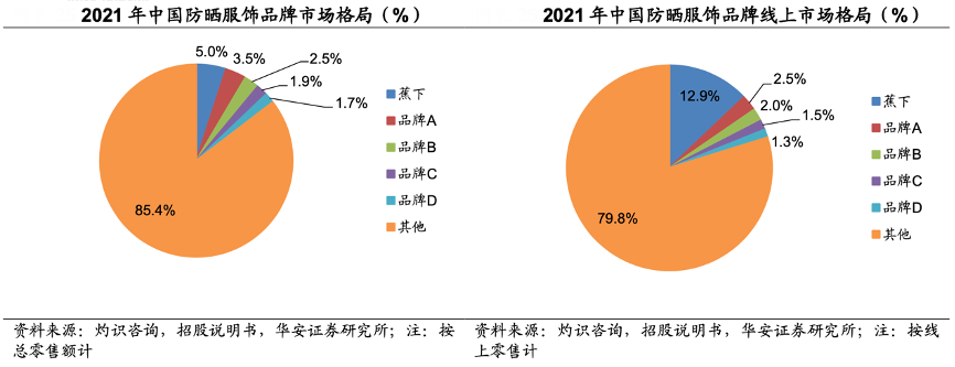 經(jīng)典案例:根據(jù)灼識咨詢、招股說明書、華安證券研究所等綜合資訊表明,結(jié)合灼識咨詢估計(jì),2021年中國防曬服飾品牌總零售額 CR5 為14.6%,其中蕉下市場份額為5.0%;線上零售額 CR5 為 20.2%,其中蕉下市場份額為12.9%。以2021年總零售額及線上零售額計(jì),公司分別擁有 5.0%和 12.9%的市場份額,已成為中國第一大防曬服飾品牌。