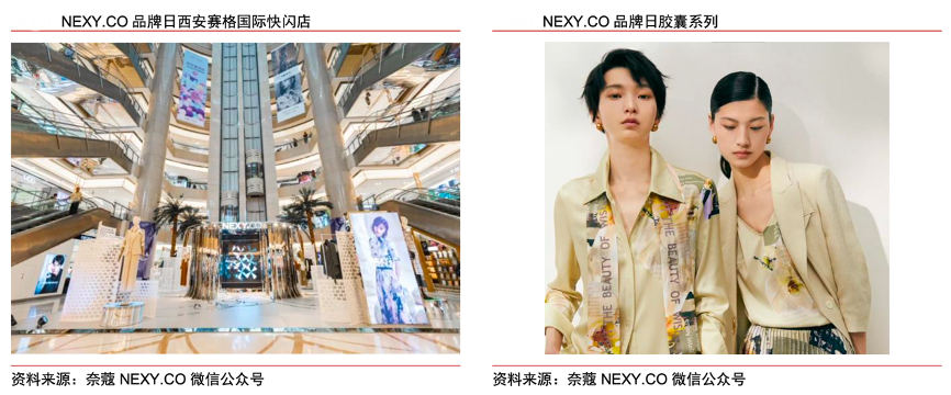 經(jīng)典案例:根據(jù)奈蔻NEXY.CO微信公眾號、中信證券研究部等綜合資訊表明,2021 年 7 月 12 日到 7 月 18 日品牌周,奈蔻在上海、西安、成都、南京等城市開設(shè)線下快閃店,開展智美探覓主題大秀,并攜手代言人王珞丹同步推出品牌日膠囊系列。該系列將品牌花“木蘭花”融入產(chǎn)品設(shè)計,贊頌當(dāng)代智美女性淡然、堅韌的品格意志,并全面升級天然材料和環(huán)保工藝,融合智美定位與環(huán)保理念。
